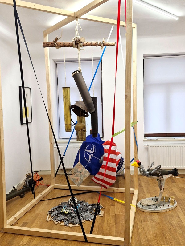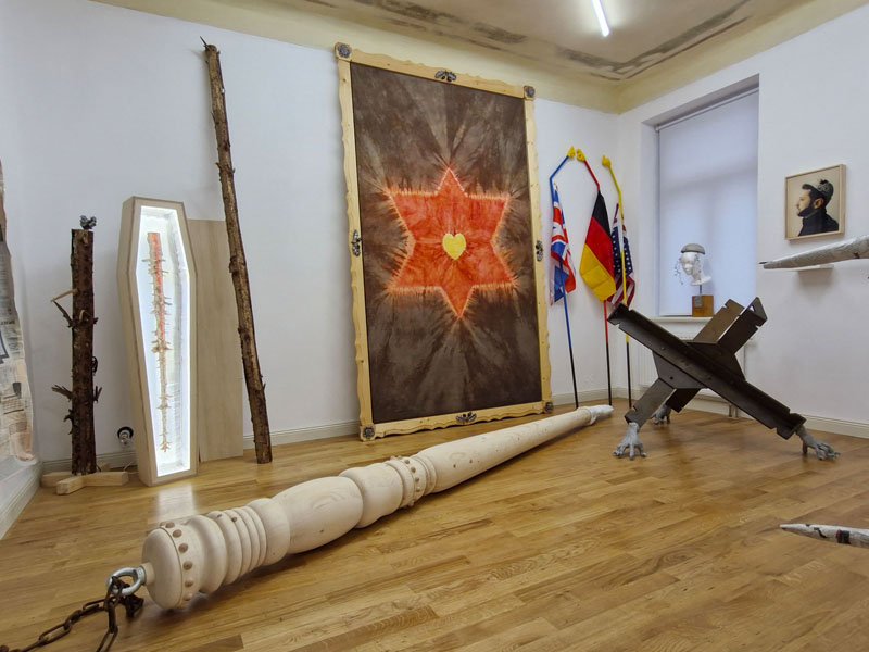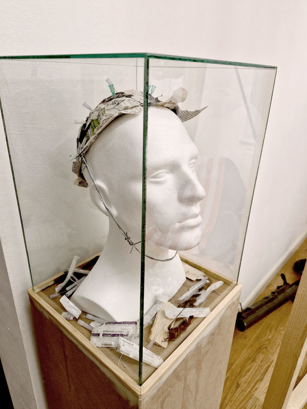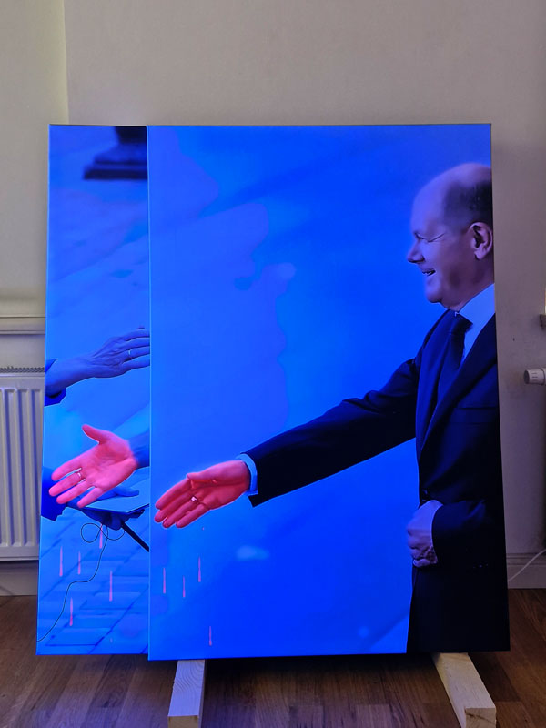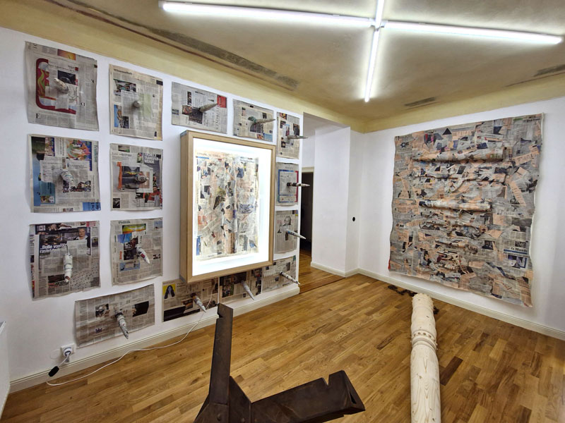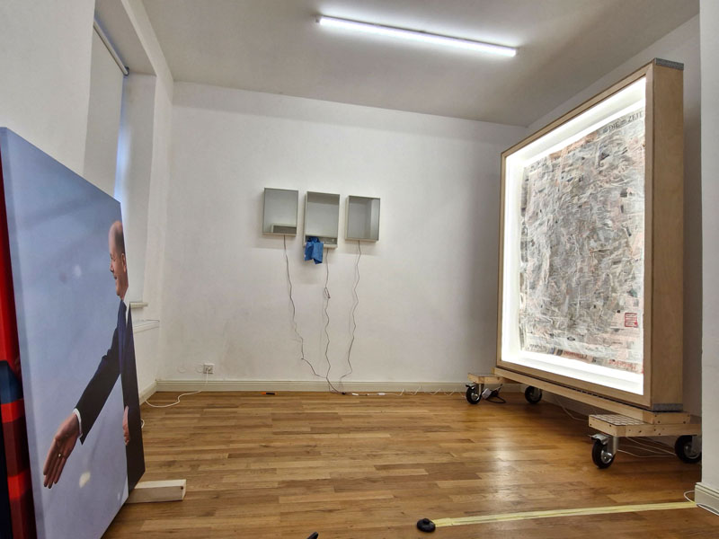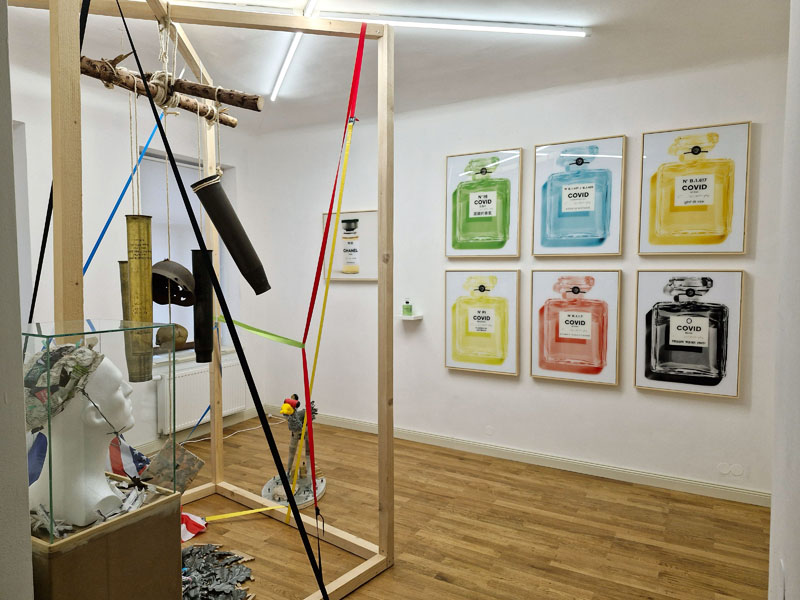 Es werden Arbeiten der letzten Jahre gezeigt, die sich mit den Verwerfungen der Coronazeit, der Kriegsthematik und aktuellen politischen Geschehnissen beschäftigen.